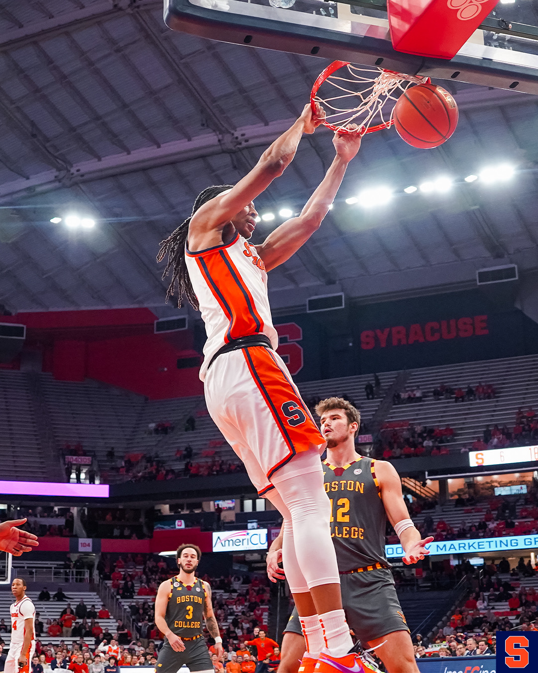 Especially at the start of the game, the Orange defense was lock down. You can make a strong case that the defense was the best its been all season. Boston College is by no means a bad offensive basketball team. They entered the contest top 50 in KenPom offensive efficiency and had the 11th least turnovers per game in the country. The Orange sped the Eagles up on offense and made them uncomfortable.