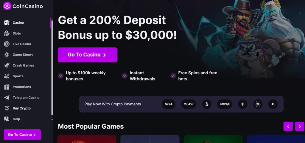 - Coin Casino: 200% match up to $30,000