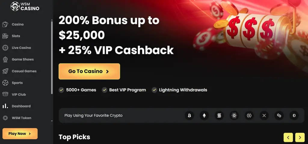- WSM Casino: 200% bonus up to $25,000