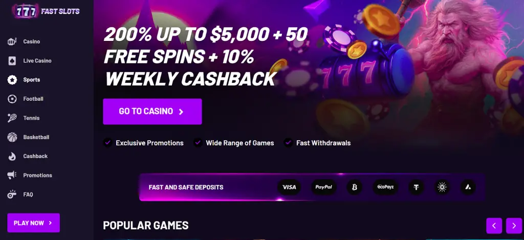 - Fast Slots: 200% bonus for new crypto depositors up to $5,000.