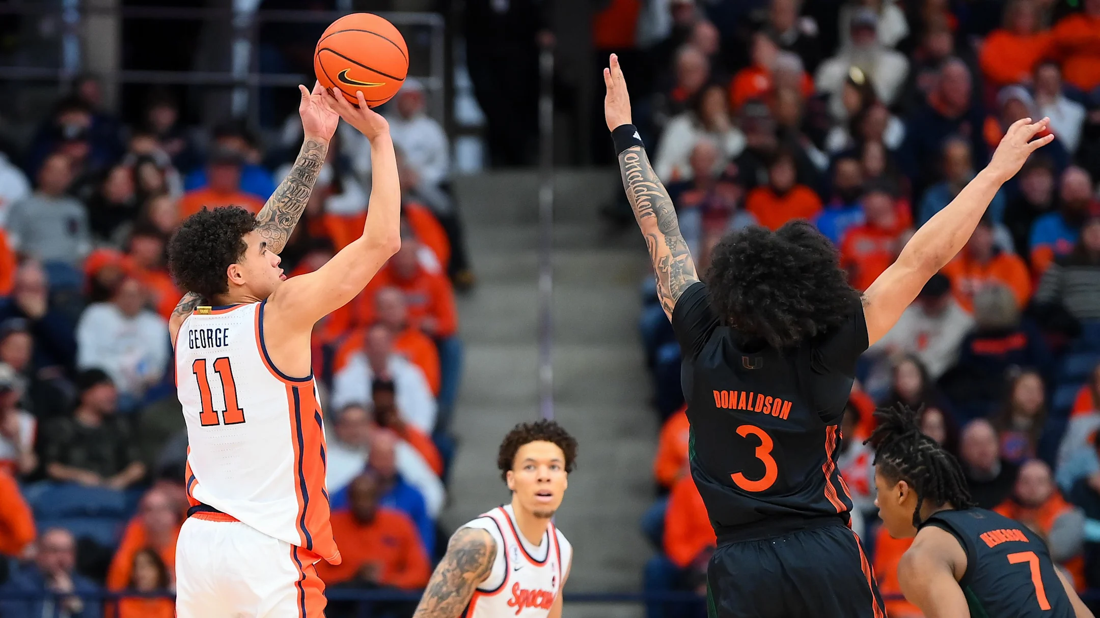 The Hurricanes stayed red hot early, knocking down five of their first six shots to grab a 20–10 advantage at the under-12 media timeout. Syracuse eventually found some life, trimming the deficit to four on a Sadiq White two-handed flush. White, who was soon subbed out for Donnie Freeman, finished with four points in 23 minutes.